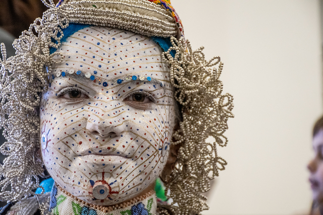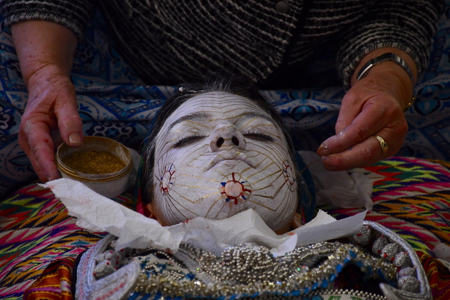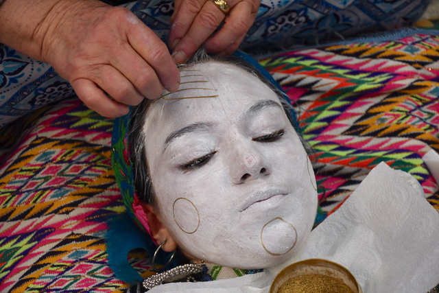 Sagdati Karavidaj, düğün günü gelinin yüzünün sabah saatlerinde boyanmaya başlandığını belirterek, "Farklı renkler kullanılır ve her rengin bir anlamı vardır, genellikle mavi, kırmızı, altın ve beyaz renkleri kullanılır. Farklı kültürlerde yaşam döngüsü anlamına gelen daireler çizilir, etrafına noktalar yapılır, onlar da çekirdek, yeni bir şeylerin başlangıcını temsil eder" diye konuştu.