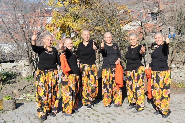 Şahize Tunçel’e destek vermek için saçlarını kazıtan arkadaşlarından Ayten Bulut, “Bu köyde oturuyoruz. Ben Şahize’nin görümcesiyim. Biz bu hastalığı duyunca çok üzüldük ama atlatacağız bunu. Şahize kemoterapi alacaktı, bunu biliyorduk zaten.
