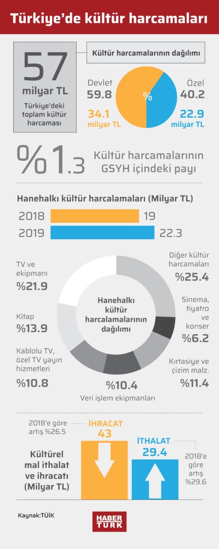 Türkiye İstatistik Kurumu (TÜİK) 2019’un Kültür Ekonomisi verilerini açıkladı: Kültür harcamaları 56 milyar TL'yi aştı. Bu veriler pandemi öncesini kapsıyor. TÜİK verilerine göre kültür harcamaları 2019 yılında 2018 yılına göre yüzde 4.7 artarak 56 milyar 957 milyon 673 bin TL oldu. Özel harcamalar artarken genel devlet harcamaları azaldı. Kültür harcamalarının gayri safi yurtiçi hasılaya oranı yüzde 1.3 oldu. Bu oran 2018 yılında yüzde 1.5'ti.