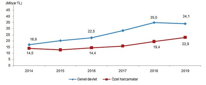 Genel devlet kültür harcamaları 2019 yılında 2018 yılına göre yüzde 2.5 azalarak 34 milyar 66 milyon 938 bin TL oldu. Özel kültür harcamaları ise yüzde 17.8 artışla 19.4 milyar TL'den 22.9 milyar TL'ye yükseldi.