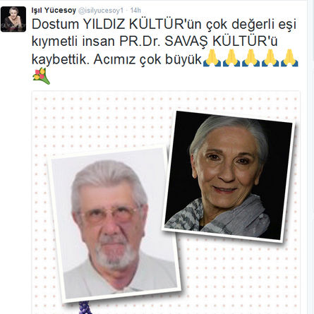 Usta oyuncu Işıl Yücesoy, Twitter hesabından “Dostum Yıldız Kültür’ün çok değerli eşi, kıymetli insan Prof. Dr. Savaş Kültür’ü kaybettik. Acımız çok büyük” yazarak yakın arkadaşı Yıldız Kültür’ün acısına ortak oldu.
