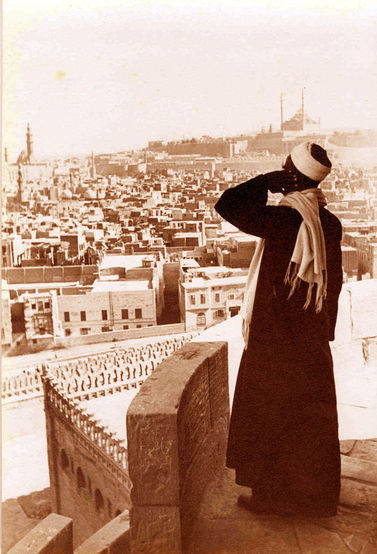 20. yüzyılın ilk yıllarının Kahire’sinde müezzin. Sağ tarafta uzakta Kavalalı Mehmed Ali Paşa’nın yaptırdığı cami görünüyor.