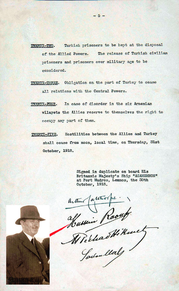 Bu 14 adet evrakın yedi adedi mütarekenin Türkçe tercümesi, ikisi o zamanın resmî gazetesi olan Takvim-i Vekayî’de yayınlanmış metin, geri kalan beş sayfa ise orijinal İngilizcesi... İngilizce metnin son sayfasında ıslak imzalar var: Mütarekeyi müttefikler adına imzalayan Akdeniz’deki İngiliz Filosu Başkumandanı Amiral Somerset Arthur Gough-Calthorpe’un, Osmanlı İmparatorluğu adına da Denizcilik Bakanı Rauf Bey’in, yani Rauf Orbay’ın, Dışişleri Müsteşarı Reşad Hikmet ile Kurmay Binbaşı Sadullah Beyler’in imzaları...