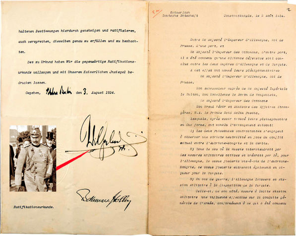 Türkiye ile Almanya arasında 2 Ağustos 1914'te imzalanan "İttifak Anlaşması"nın mevcudiyeti bilinirdi ama orijinal metni ile Alman İmparatoru Wilhelm'in onay belgeleri bugüne kadar ortaya çıkmamıştı. Başbakanlık Osmanlı Arşivleri'nde önceki gün açılan "Muahedeler", yani "anlaşmalar" bölümündeki 463 adet evrak arasında Osmanlı İmparatorluğu'nun çökmesine sebep olan bu "uğursuz" anlaşma da var. Anlaşmayı Gazete Habertürk yazarı Murat Bardakçı yazdı