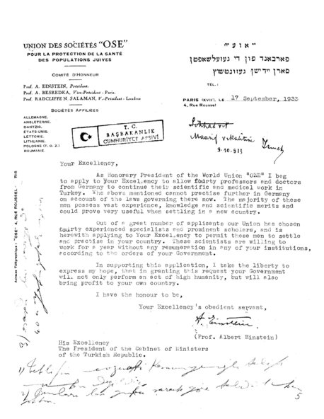 Altında imzası olmasına rağmen, mektubu kaleme alan Albert Einstein değil OSE yönetimiydi. Özel sekreterinin açıkladığına göre Albert Einstein 17 Eylül’ü kapsayan 10 gün boyunca Paris’te değildi. Ama OSE antetli boş kâğıtlara imzalar atmış, gerektiğinde kullanılması için OSE yönetimine bırakmıştı. Bu durumda bu belge bir Einstein mektubu sayılabilir miydi? Bence sayılırdı, çünkü birçok politikacının konuşmalarını ‘ghost writer’ların yazmasına rağmen, bunlar o liderlerin sözleri olarak kabul edilmiyor muydu? Bu da öyle bir şeydi. Kendisi Paris dışında olsa da, mutlaka bu mektupta neler yazıldığından haberdardı. Albert Einstein imzası ile gelen mektup, onun kişisel değil ama resmi bir mektubuydu. (...) O dönemde Başbakan İsmet Bey’di. Daha soyadı kanunu kabul edilmediği için henüz İnönü soyadını almamıştı. Başbakan, bu mektubu alınca kendi el yazısıyla kenarına bir not düşüp Milli Eğitim Bakanı Dr. Reşit Galip’e göndermişti. Ama sonra ortaya çıkan sonuç olumsuzdu. Başbakan İsmet Bey, Einstein’ın isteğini reddetmiş ve 14 Kasım 1933 tarihinde şöyle bir mektup göndermişti: