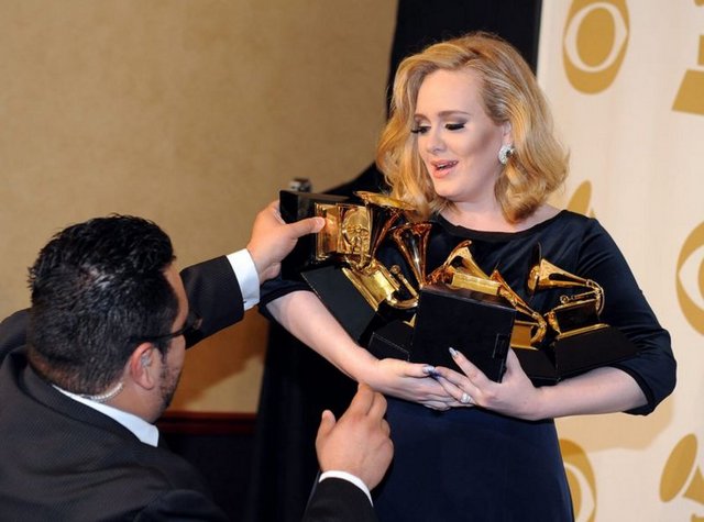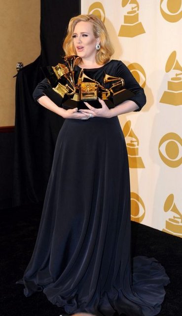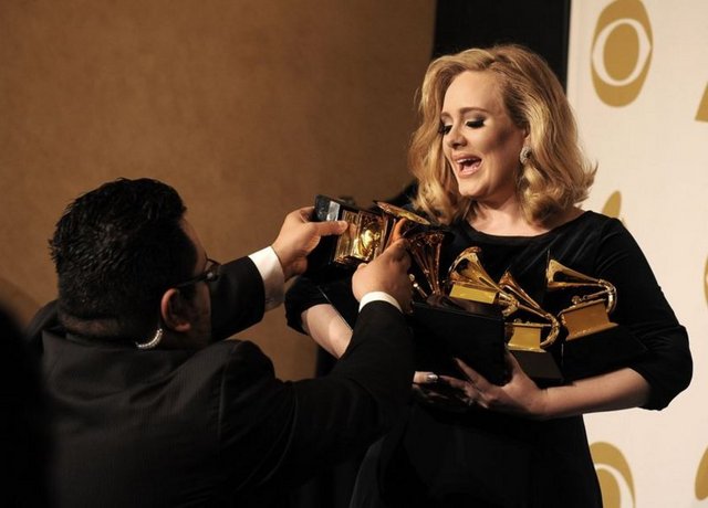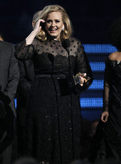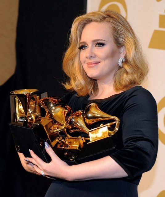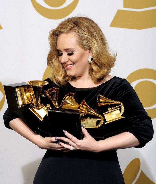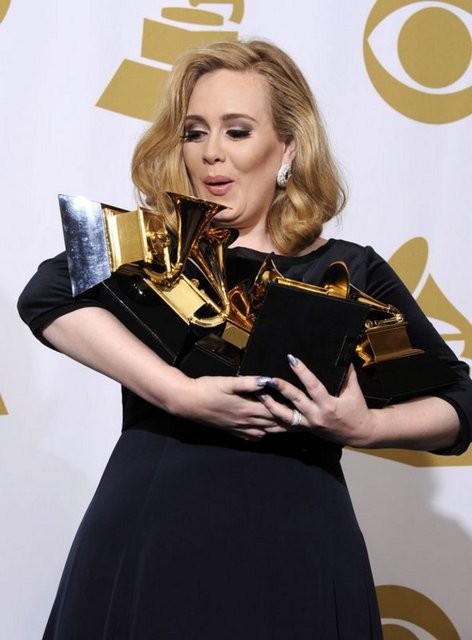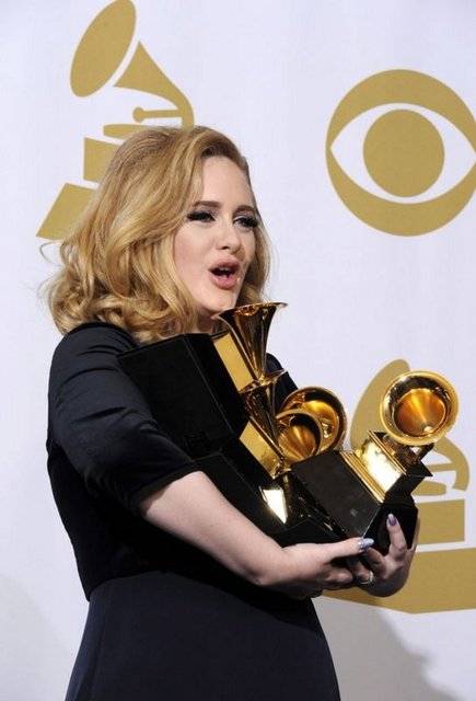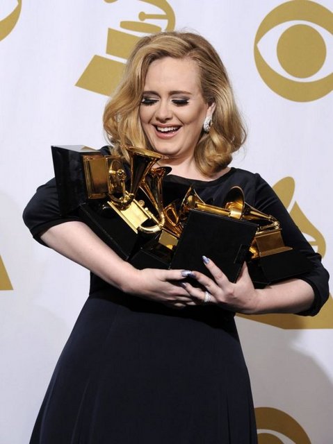 Geceye damgasını "21" albümüyle, yılın en iyi şarkısı ve albümü dahil olmak üzere 6 dalda ödül kazanan İngiliz şarkıcı Adele vurdu. Adele'nin "21" albümü, geçen yıl 6 milyondan fazla satmış ve müzik listelerinin ilk sırasına oturmuştu.