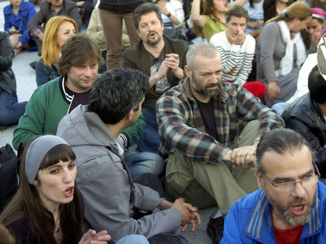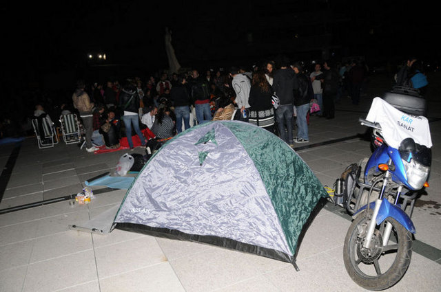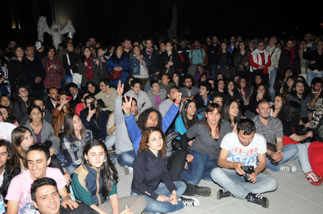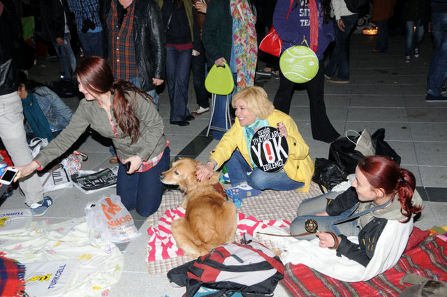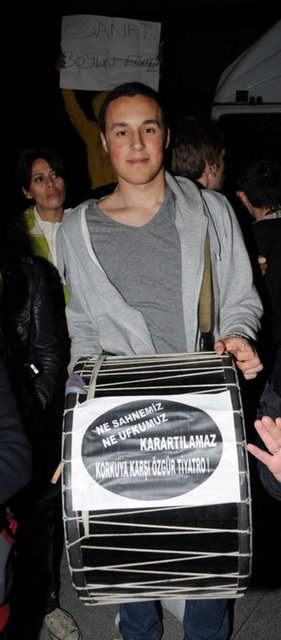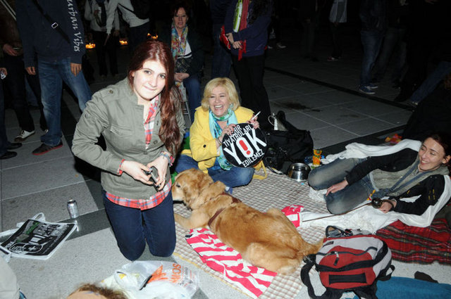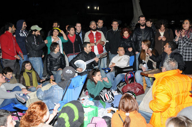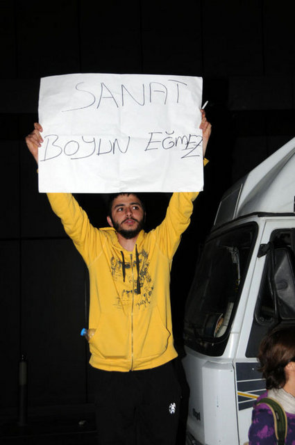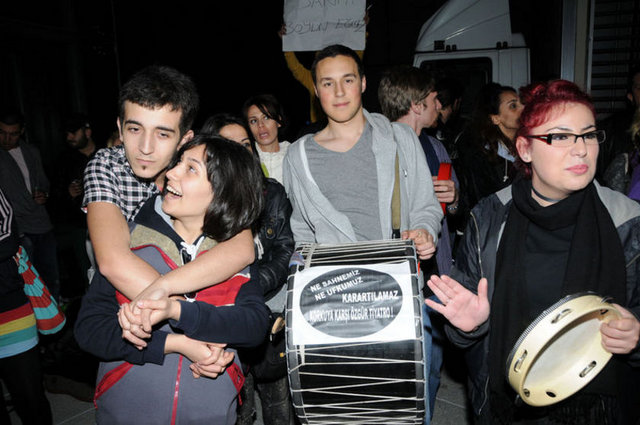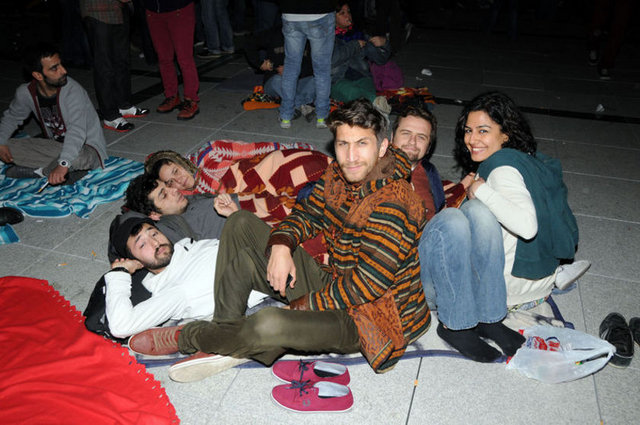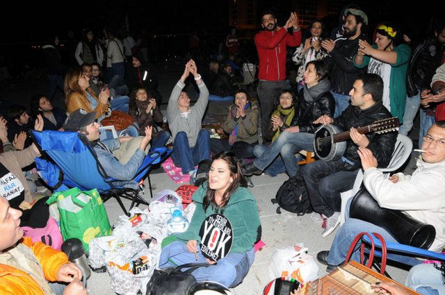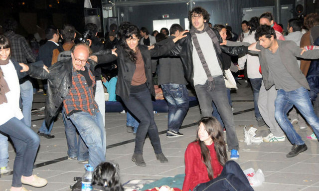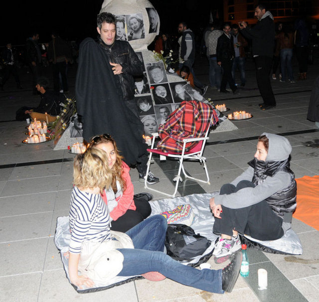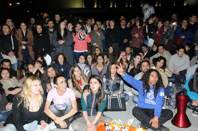 Tiyatrocular, bu kez sahnelenen bir oyunda değil, kendi hakları için açık hava sahnesindeydi. Çalınan müziklerle coşan tiyatro oyuncuları ve onları destekleyenler halaylar çekip, kararı protesto etti. Geceyi burada geçirecek olan oyunculardan bazıları yanlarında getirdikleri uyku tulumlarının içine girerek dinlenmeye çalıştı.