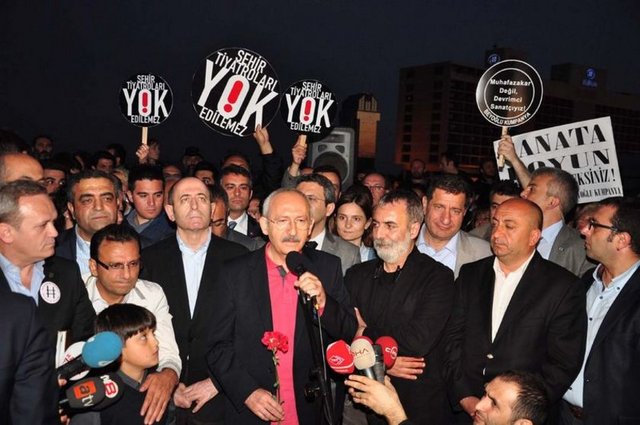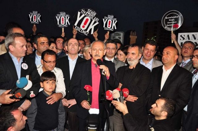 Cumhuriyet Halk Partisi (CHP) Genel Başkanı Kemal Kılıçdaroğlu, İstanbul Şehir Tiyatroları'ndaki yönetmelik değişikliğini protesto eden tiyatrocuların eylemine katıldı. Aklı başında hiçbir siyasetçinin sanatçıyla kavga etmeyeceğini belirten Kılıçdaroğlu, "Siyasetçinin sonunu getiren sanatçıyla kavga etmesidir." dedi.