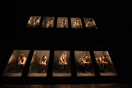 Tekand’ın yorumunda ise; yine şimdiki zamanda, sıkışıp kalmış hissi uyandıran, küçük kutuların içinde, alt alta, üst üste, trajikomik, ışığı manüel olarak yöneten oyuncularla birlikte, 17 kişilik bir kadronun rol aldığı, hikayenin müziklerle ve ışığın hikaye ile grift şeklinde ilerlediği, tekrarın içinde tekrarın gani tutulduğu ve böylelikle kelime oyunlarının, biz izleklerin frekans noktasına daha da koyudan sarktığı, kısaca oyun içinde oyun olarak ortaya çıkıyor. Ki oyunda kullanılan ışık-ses uyumu şahane… Hikayenin öznesini, istediği yere taşıması bakımından, bu ışık kullanımını çok etkileyici buldum.
