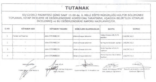 Sansürcü zihniyet yaygınlaşıyor... 2013'ün ilk haberlerinden biri "sansür talebi" oldu. (...) Komisyon, Steinbeck'in bu romanının hangi yayınevlerince yayımlandığını da araştırıyor ve yayınevlerinin kitaplarındaki sakıncalı bölümlerin sayfalarını da tek tek tespit ediyor. Bir rapor halinde "öğrencilerin eğitimine uygun olmayan bölümler" tespit edildiğini belirterek raporu ve ekli listeyi Milli Eğitim Bakanlığı Destek Hizmetleri Genel Müdürlüğü'ne arzediyor. Steinbeck'in "Fareler ve İnsanlar" romanı Milli Eğitim Bakanlığı'nca hazırlanan liselerde okutulacak "100 Temel Eser Listesi"nde yer almaktadır. Onlarca yıldır tüm Dünyada okunan bu önemli klasik ülkemizde de en çok okunan, sevilen romanlardandır. Tek tek şehirlerde öğretmenlerin kurul oluşturup Dünya Klasiklerini ahlaki açıdan incelemelerini ve yasak ya da sansür talebinde bulunmaları sansürcü zihniyetin tüm ülke çapında yaygınlaştırılması, iller düzeyinde kitap yasaklamaları yapılması anlamına gelmektedir. Lise öğrencileri birer genç yetişkin olarak okuyacakları kitapları kendileri seçecek niteliktedir. Steinbeck'in ne kadar önemli bir yazar olduğunun, "Fareler ve İnsanlar"ın edebi öneminin, nasıl bir konu işlediğinin, ne kadar önemli hayat dersleri verdiğinin bilincindedir. İzmir Milli Eğitim Müdürlüğü'nün kurul kurup "ahlaki açıdan" kitap incelettirmesi, sansür talebinde bulunması ülkemizde sansürcü zihniyetin ne boyutlara ulaştığının çarpıcı ama utanç verici bir örneğidir. Umarız son örnek olacaktır. Milli Eğitim Bakanı Ömer Dinçer'in "Kitapları İnceleme ve Değerlendirme Komisyonu" türünden yasakçı, sansürcü komitelerin kurulmasını engellemesini, il milli eğitim müdürlerini, öğretmenleri Türkiye'nin başta Avrupa İnsan Hakları Sözleşmesi olmak üzere uluslararası birçok düşünce, ifade, vicdan ve din özgürlüğü ile hukukun üstünlüğü ilkesiyle ilgili sözleşmelerde imzası bulunan bir ülke olduğunu ve bu tür yasakçı, sansürcü girişimlere izin vermeyeceğini açıklamasını bekliyoruz.