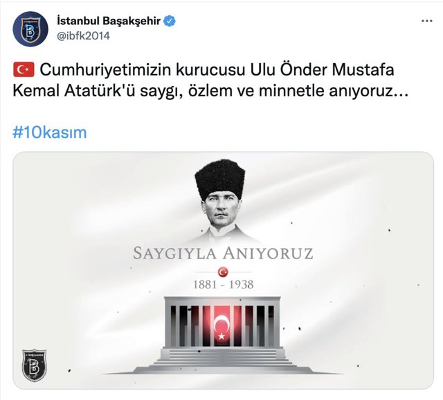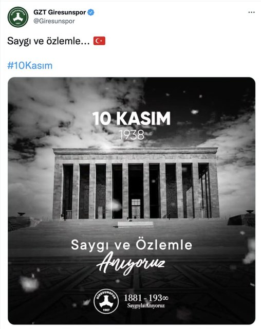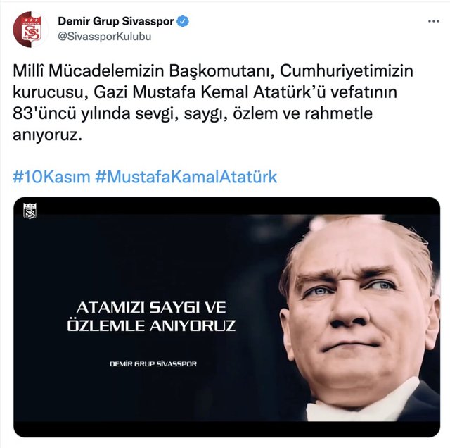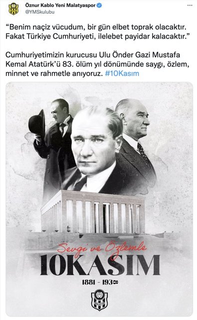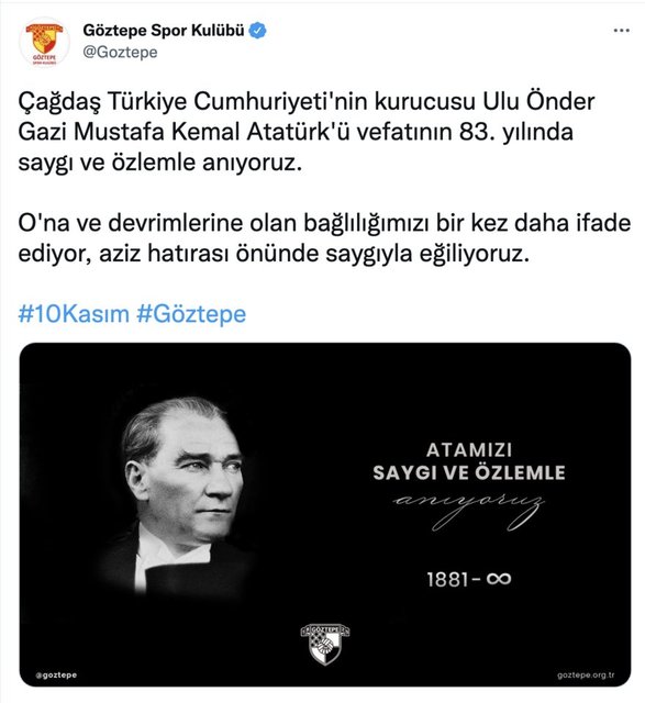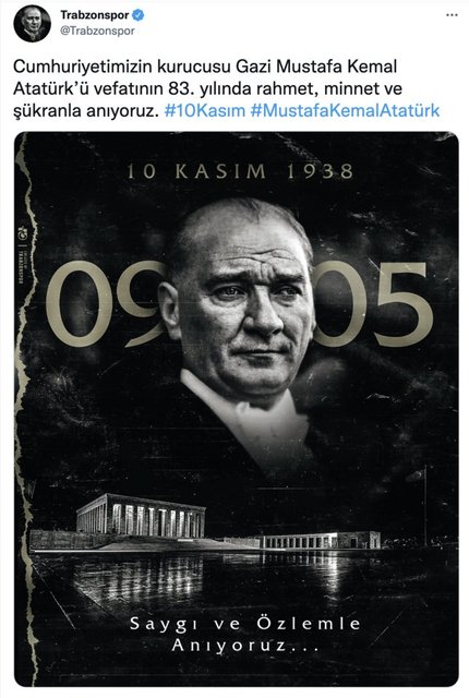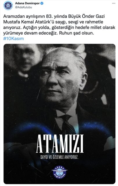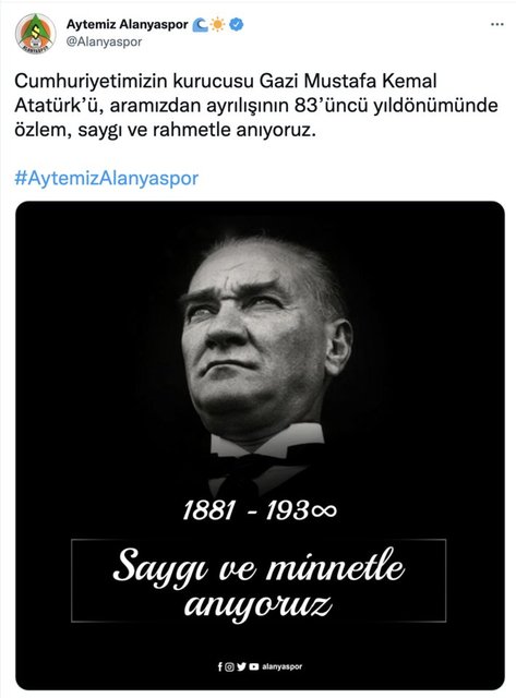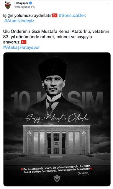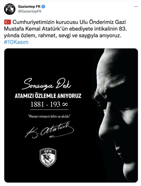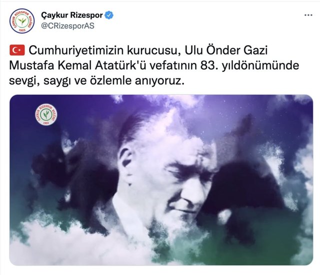Türkiye Cumhuriyeti'nin kurucusu Gazi Mustafa Kemal Atatürk'ün ebediyete intikalinin 83. yılında kulüplerden anma mesajları geldi