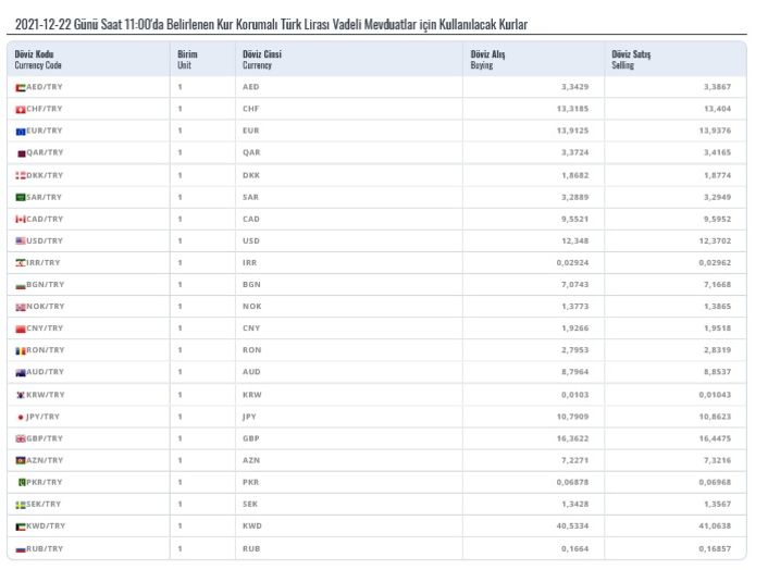 Türkiye Cumhuriyet Merkez Bankası (TCMB), Kur Korumalı Türk Lirası Vadeli Mevduatlar için kullanılacak kurları açıklamaya başladı. Hazine ve Maliye Bakanlığı, kur farkı hesaplamaları için TCMB'nin her gün saat 11:00’de dolar döviz alış kuru yayınlayacağını duyurmuştu.