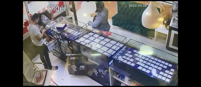 Yapancı uyruklu oldukları ileri sürülen 2 kişi, kuyumcu çalışanı Ender Gencer'e (21) kızlarına doğum günü hediyesi alacaklarını söyleyerek, altınlara bakmaya başladı. Seçtikleri ürün için sözde pazarlık yapan şüpheliler, oyaladıkları Gencer'in bir anlık dalgınlığından faydalanıp, çekmeceden içinde altın bulunan poşeti aldı. Çalışana fiyatta anlaşamadıklarını söyleyen şüpheliler, koşarak olay yerinden uzaklaştı. O anlar güvenlik kamerasına saniye saniye yansıdı.