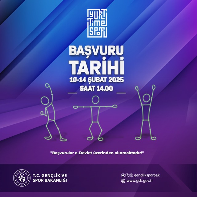 Yurt Time Spor Projesi başvuruları bugün saat 14.00 itibarıyla başlıyor. 10-14 Şubat 2025 tarihleri arasında e-Devlet üzerinden yapılacak başvuruları kaçırmayın!’’ ifadelerine yer verilmişti.