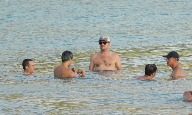 İkiliye arkadaşları da eşlik etti. Leonardo DiCaprio, erkek arkadaşlarıyla birlikte hem yüzdü hem sohbet etti.