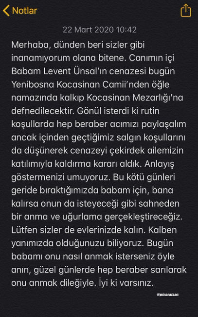 Merhaba... Dünden beri sizler gibi inanamıyorum olana, bitene. Canımın içi babam Levent Ünsal'ın cenazesi bugün Yenibosna Kocasinan Camii'nden öğle namazında kalkıp, Kocasinan Mezarlığı'na defnedilecektir. Gönül isterdi ki rutin koşullarda hep beraber acımızı paylaşalım ancak içinden geçtiğimiz salgın koşullarını da düşünerek cenazeyi çekirdek ailemizin katılımıyla kaldırma kararı aldık.