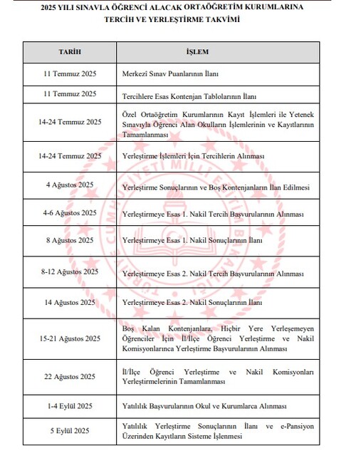 Yerleştirme sonuçları ve boş kontenjanlar, 4 Ağustos 2025 tarihinde ilan edilecek. Ardından iki aşamalı nakil süreci başlayacak.