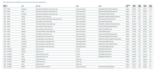 Geçen seneye ait 2022 liselerin Taban/Tavan puanları ve yüzdelik dilimleri listesi aşağıdaki gibidir;