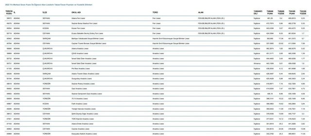 Geçen seneye ait 2022 liselerin Taban/Tavan puanları ve yüzdelik dilimleri listesi aşağıdaki gibidir;