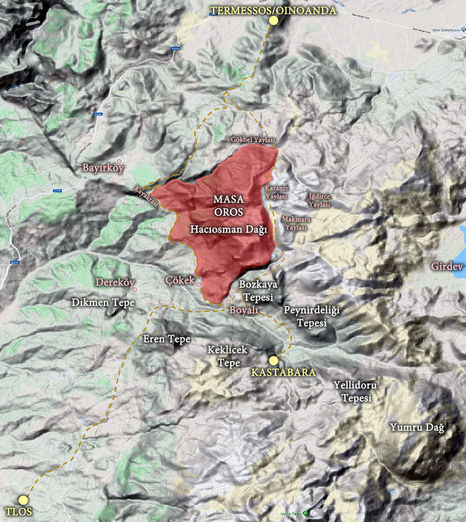 Likya'nın 2 bin 300 yıl önce en önemli yerleşimlerinden olan Termessos ve Tlos antik kentlerinden Muğla Seydikemer'e bağlı Seki yakınlarındaki Oinoanda yöresine göç edenlerin kurduğu diğer Termessos arasında sınır çatışmasına konu olan antik 'Masa Dağı'nın yeri, uzun süren araştırmalar sonunda belirlendi.