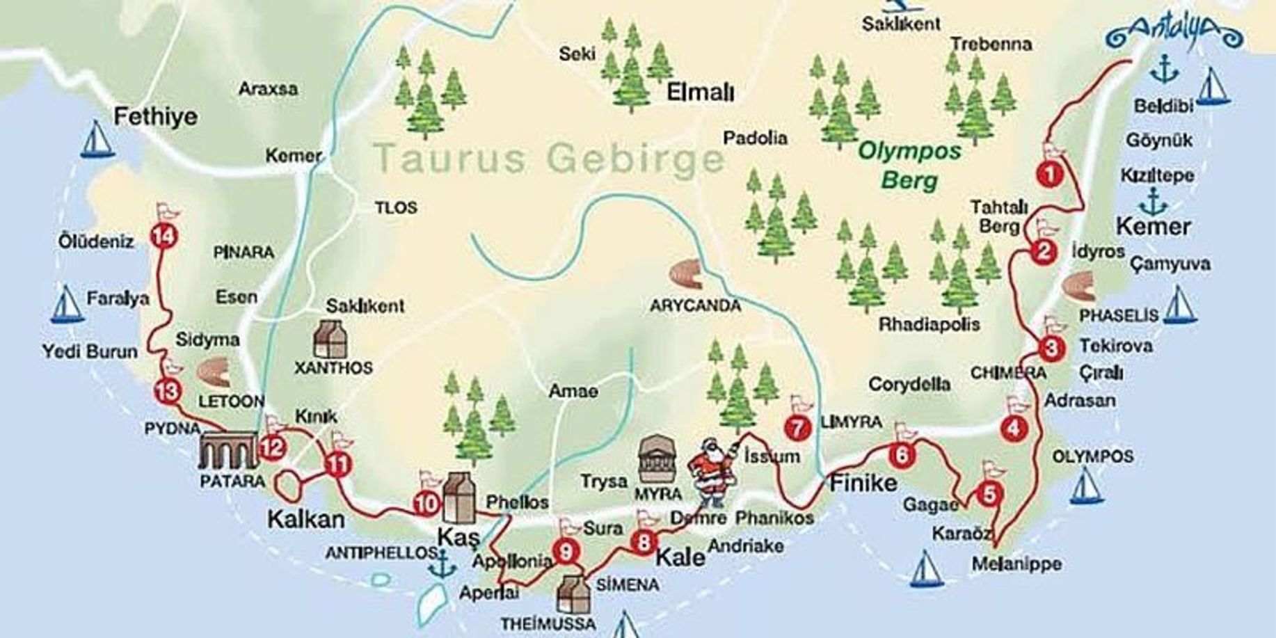 Türkiye'nin en uzun yürüyüş parkurlarından biri olan 540 kilometrelik Likya Yolu, Fethiye'den başlayıp Antalya'da sona eriyor. Güzergâh üzerinde; Patara, Xanthos, Olympos, Kayaköy, Faralya ve Kabak Koyu gibi Antik Likya medeniyetinin izlerini taşıyan parkur, her yıl dünyanın dört bir yanından on binlerce kişiyi ağırlıyor.