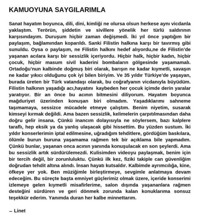 İsrail asıllı Türk vatandaşı olan şarkıcı Linet, geçtiğimiz hafta İstanbul Maslak'ta sahne alacağı mekânın önüne gelen bir grup tarafından protesto edilmişti. Sosyal medya hesabından gözyaşlarına hâkim olamadığı bir video yayımlayan Linet, yaşadığı üzüntüyü ve can güvenliği endişesini dile getirmişti.