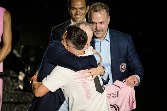 Messi, beyaz tişörtü ve kot pantolonuyla sahneye çıkarken takım sahiplerine sarıldı.