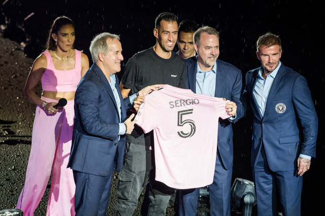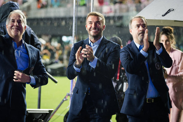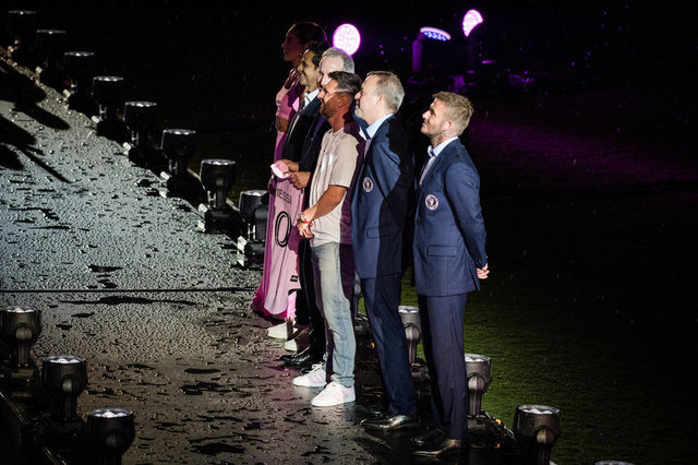 Inter Miami'nin sahipleri David Beckham ve Jorge Mas, Sergio Busquets ve Lionel Messi'yi DRV PNK Stadyumunda sağanak yağmur altında sahneye davet etti.