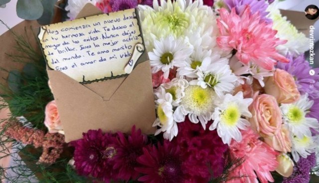 Çiçeğe iliştirilen kartta, İspanyolca "Bugün hayatının yeni bir dönemi başlıyor. Sana büyük başarılar diliyorum. Hiç bir zaman ışıltını kaybetme. Sen dünyanın en iyi oyuncususun. Seni seviyorum monito. Sen hayatımın aşkısın" ifadeleri yer almıştı.
