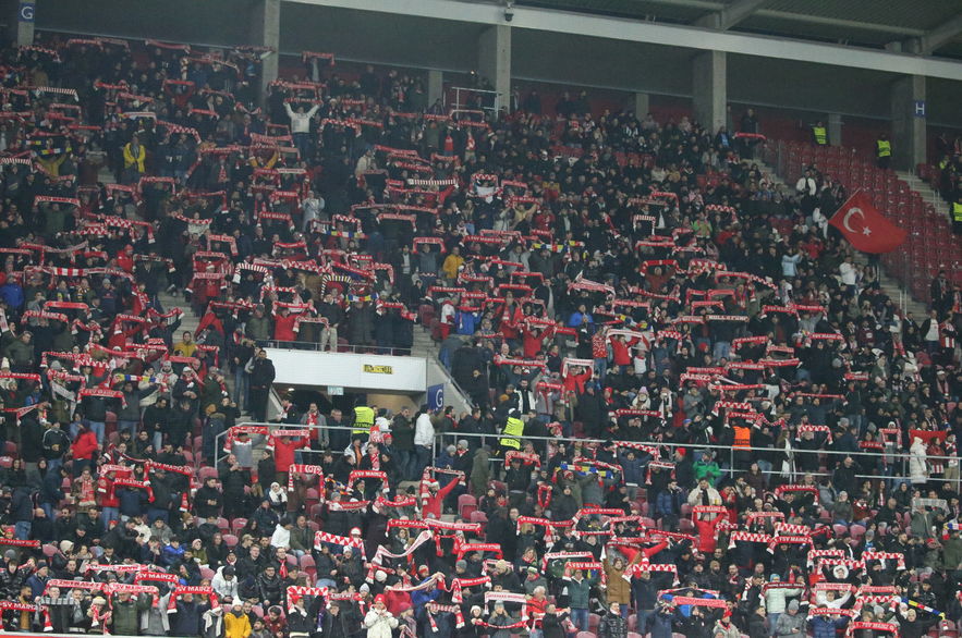 Mainz kentindeki meydanda bir araya gelen kırmızı-beyazlı taraftarlar, burada sloganlar atarak stadyuma geçti.