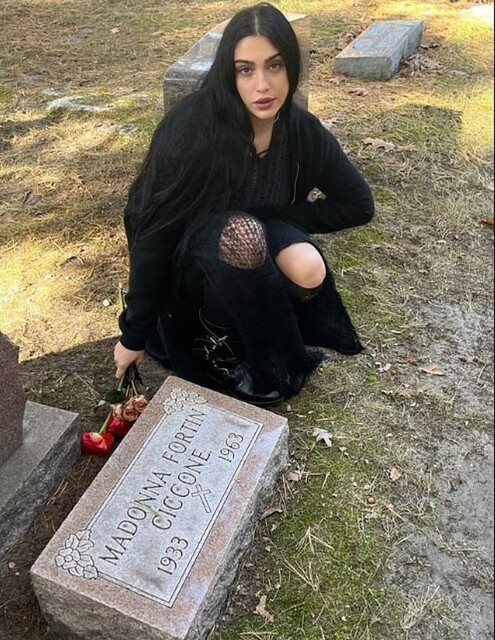 Ünlü şarkıcının en büyük çocuğu olan 28 yaşındaki Lourdes, büyükannesinin mezar taşının yanında diz çökerek fotoğrafını çektirdi.