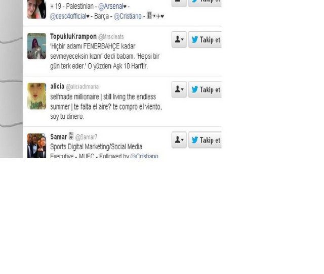 Real Madrid'in yıldızı Cristiano Ronaldo'nun Twitter'da takip ettiği 72 kişi arasında bir de Türk kızı var. 17.5 milyon takipçisi olan Ronaldo, sevgilisi Irna Shayk ve Justin Bieber'ın yanı sıra 'TopukluKrampon' rumuzlu Uludağ Üniversitesi öğrencisi Ezgi'yi takip ediyor