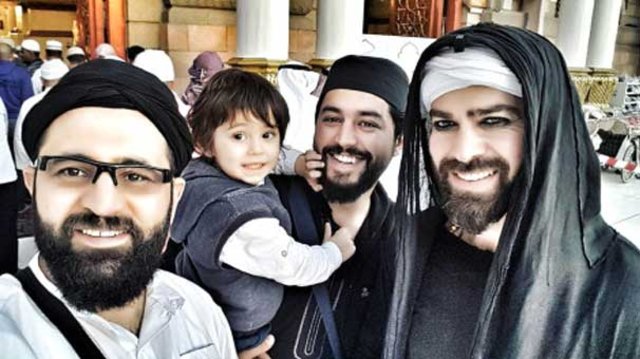 Medine'de Uğur Pektaş ile karşılaşan Instagram fenomeni Fatih Koyuncu da beraber çekildikleri fotoğrafı sosyal medya hesabından paylaştı.Sarık sarıp cübbe giyen ünlü oyuncunun, gözlerine Arap sürmesi çektiği görüldü.