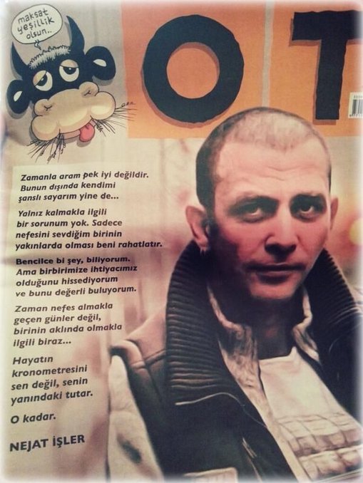 Hayata şiirle tutunan adam! 20 gün önce Bodrum’da rahatsızlandıktan sonra çoklu organ yetmezliği teşhisiyle yoğun bakıma alınan Nejat İşler’in yazdığı son şiir, Ot Dergisi’nin şubat sayısına kapak oldu. Yoğun bakımdaki tedavisi İstanbul’da devam eden İşler, rahatsızlanmadan birkaç gün önce dergiye gönderdiği şiirde, zamanla arasının pek iyi olmadığını, ‘nefesini sevdiği birinin’ yakınlarında olmasının ise kendisinin rahatlattığını söylüyor.
