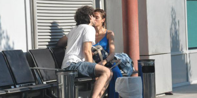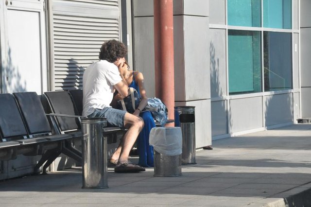 Atatürk Havalimanı CIP giriş kapısına yakın bir banka oturan sevgililer, veda saati yaklaşınca öpüşmeye başladı.