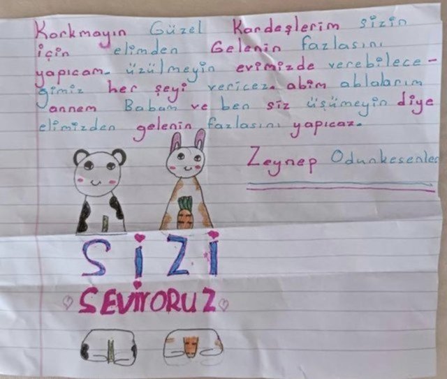 Mahsun Kırmızıgül, daha önce de "Korkmayın güzel kardeşlerim sizin için elimden gelenin fazlasını yapacağım. Üzülmeyin evimizde verebileceğimiz her şeyi vereceğiz. Ağabeyim, ablalarım, annem ve ben siz üşümeyin diye elimizden gelenin fazlasını yapacağız" notunu yazan minik Zeynep'in mesajını paylaşmıştı.