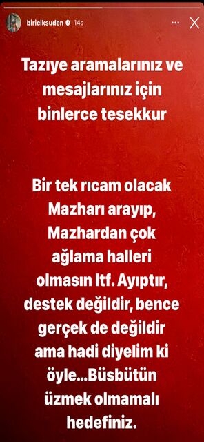 Biricik Suden, yaptığı paylaşımda; "Bir tek ricam olacak, lütfen Mazhar'ı arayıp ondan daha fazla ağlamayın. Bu ayıptır, destek değildir ve bence gerçek de değildir; ama diyelim ki öyle... Hedefiniz büsbütün üzmek olmamalı," ifadelerini kullandı.