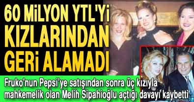 Fruko'yu 2002 yılında 100 milyon dolara Pepsi’ye sattıktan sonra üç kızıyla mahkemelik olan Melih Sipahioğlu, kızlarına bağış olarak verdiği 60 milyon YTL değerindeki gayrimenkul ve nakit parayı geri almak amacıyla açtığı davayı kaybetti.