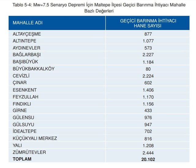 Maltepe’de Mw=7.5 senaryo depremi sonrasında yaklaşık 20.102 hanelik acil barınma ihtiyacının ortaya çıkacağı tahmin edilebilir. Hane başına 3 kişilik nüfus kabulüyle, yaklaşık 60.306 kişinin acil barınma ihtiyacı olacağı beklenmektedir.
