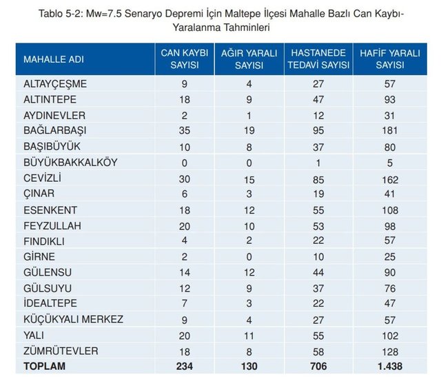 7.5 büyüklüğündeki senaryo depreminin, en kötü senaryo olan gece meydana gelmesi halinde, Maltepe’de ortalama 234 civarında can kaybı meydana gelebileceği, yaklaşık 130 kişinin ağır yaralanabileceği ve 706 kişinin de hastane şartlarında tedavi görmesi gerekebileceği öngörülmektedir.