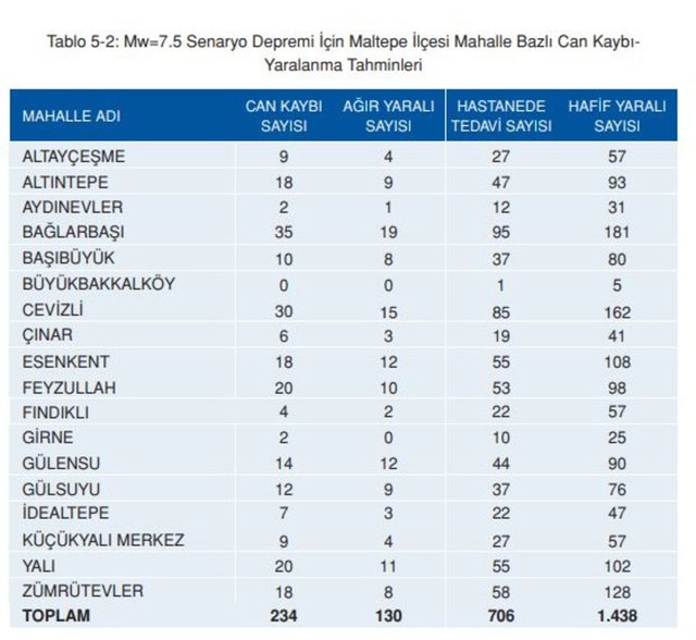 * Senaryo depremi için Maltepe ilçesi mahalle bazlı can kaybı ve yaralanma tahminler