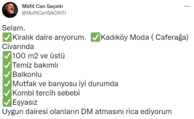 Mandıra Filozofu filminde canlandırdığı karakterle hafızalara kazınan ünlü oyuncu Müfit Can Saçıntı, sosyal medya hesabından ev aradığına dair duyuru yaptı. Saçıntı'nın kriterleri görenleri şaşırttı.