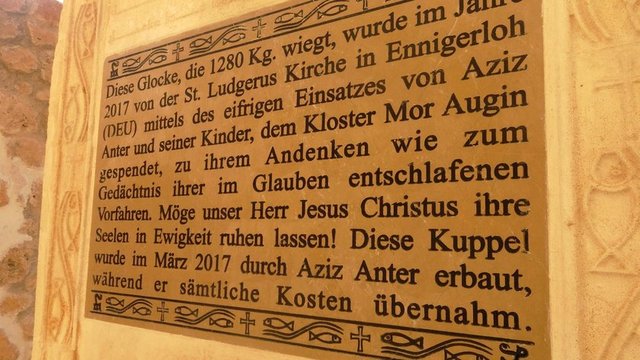 Mor Evgin Manastırı'nda eğitim görmek üzere Almanya'dan gelen Davut Sakral ise manastıra takılan çanın 1959 yılında, Almanya'da, bronzdan yapıldığını söyledi. Çanın, ağırlığı bakımından Türkiye'deki manastırlar ve Süryani Cemaati'ne ait dini tapınaklardaki en büyük çan olduğunu anlatan Sakral, "1 ton 280 kilo ağırlığında olan bu çan, Süryani Cemaati'mizden Aziz Anter ve çocuklarının gayretli çabaları ve masraflarını üstlenmeleri sayesinde, 2017 yılında Almanya'daki Aziz Ludgerus Kilisesi tarafından yaptırdığı kilise çanını atalarının anısına bağışladı. İsa Mesih, sonsuza dek ruhlarını dinlendirsin" diye konuştu.