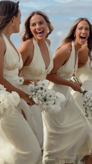 Margot Robbie de diğer nedimeler gibi krem rengi saten bir elbise giydi ve elinde çiçek buketi taşıdı.