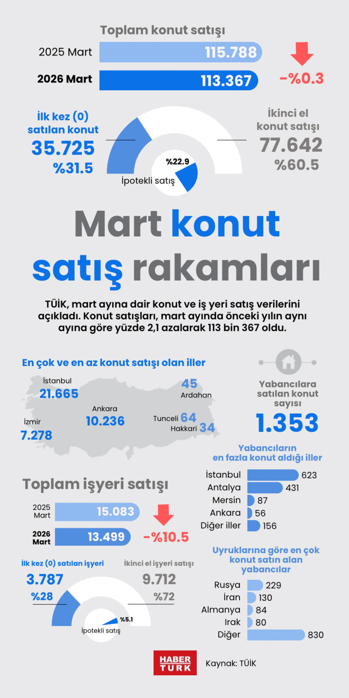 Konut satışları, mart ayında önceki yılın aynı ayına göre yüzde 2,1 azalarak 113 bin 367 oldu. Kredili satışlar, toplam satışın yüzde 22,9'unu oluşturdu. Böylece kredili satışlar, Mayıs 2023'ten bu yana en yüksek orana ulaştı. ABD-İsrail ve İran arasındaki savaş nedeniyle yükseliş beklentisi olan yabancıya satışın oranı önceki 2 ayla aynı kaldı