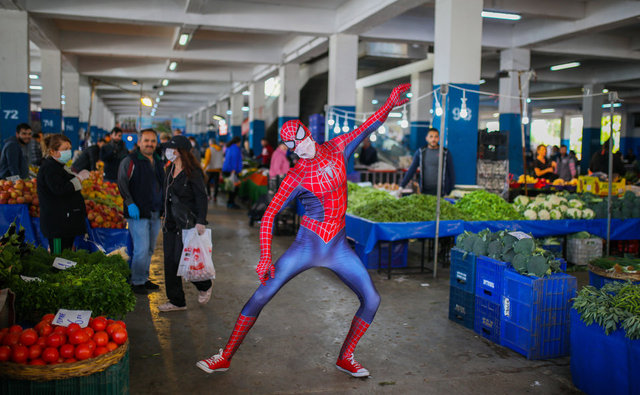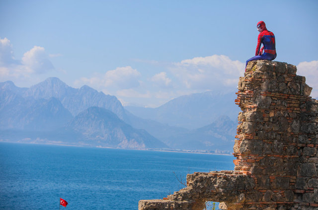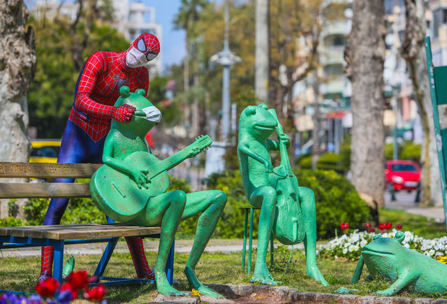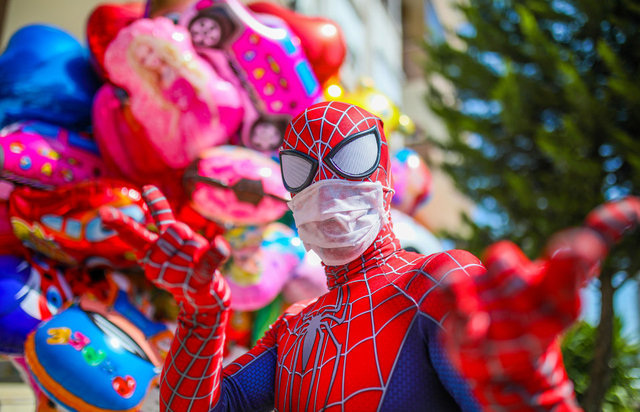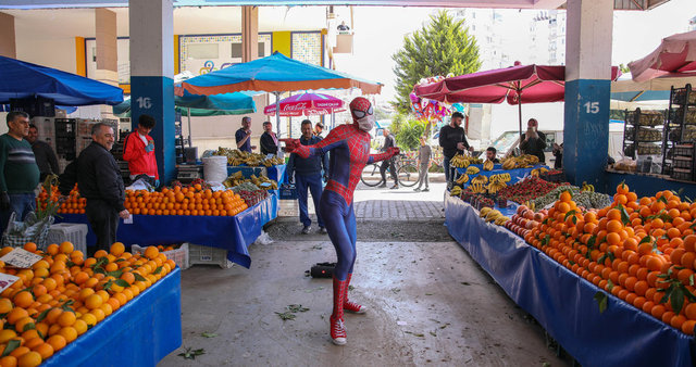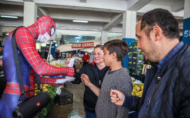 Antalya'da 'Spiderman' (Örümcek Adam) kostümüyle insanların sevgisini kazanan 27 yaşındaki Burak Soylu, eczaneden aldığı maskeleri semt pazarı ile sokakları gezerek dağıttı. Maske dağıtan Örümcek Adamı gören vatandaşlar şaşkınlıklarını gizleyemedi