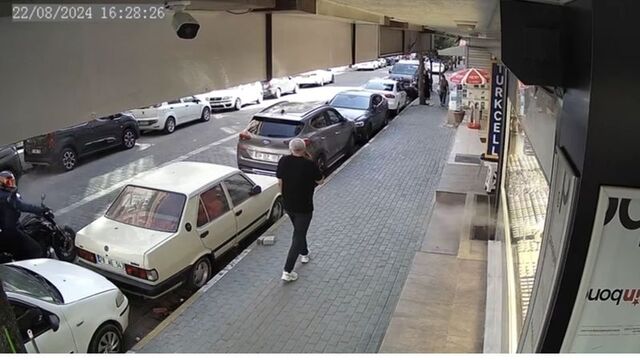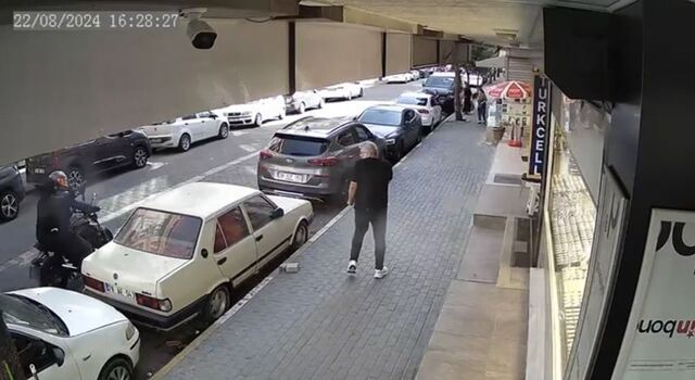 Saldırı anı iş yerinin güvenlik kamerasına yansıdı. Görüntülerde, motosikletle sokağa gelen kasklı iki kişiden artçı olanın iş yerlerine silahla ateş ettiği, o esnada telefonla konuşarak kaldırımda yürüyen bir kişinin kendisini yere atarak son anda kurtulduğu görülüyor.