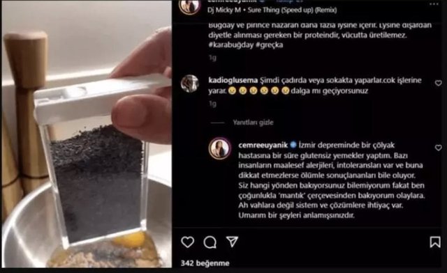 Cemre Uyanık ise yoruma şu cevabı verdi: "İzmir depreminde bir çölyak hastasına bir süre glutensiz yemekler yaptım. Bazı insanların maalesef alerjileri, intoleransları var ve buna dikkat etmezlerse ölümle sonuçlananları bile oluyor.