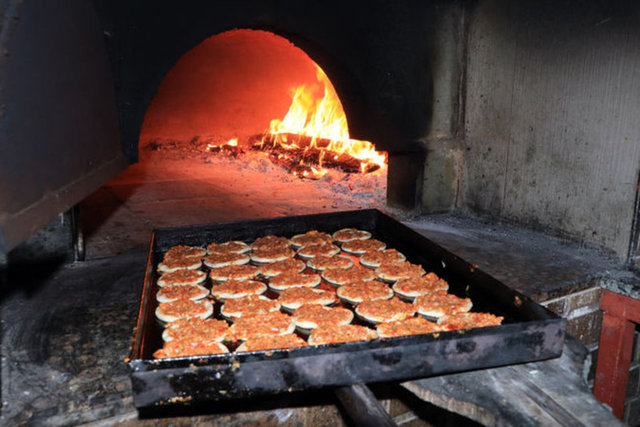 Çay bardağı altı büyüklüğündeki hamur bezelerini açarak bir fırın tepsisine yerleştirin ve üzerlerine hazırladığınız iç harcı sürün.