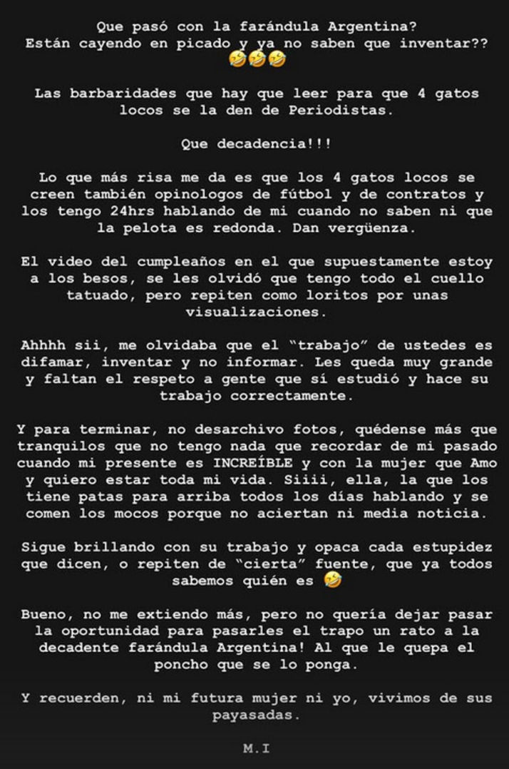 Mauro Icardi; "Sözde birinin öpüştüğü o doğum günü videosuna gelince; boynumun tamamen dövmeli olduğunu unutmuşlar ama sırf üç beş izlenme uğruna papağan gibi aynı şeyi tekrarlayıp duruyorlar. Ah, doğru ya! Sizin 'işinizin' bilgilendirmek değil; iftira atmak ve yalan uydurmak olduğunu unutmuşum. Bu meslek size birkaç beden büyük gelir; işini hakkıyla yapan insanlara saygısızlık ediyorsunuz" ifadelerini kullandı.
